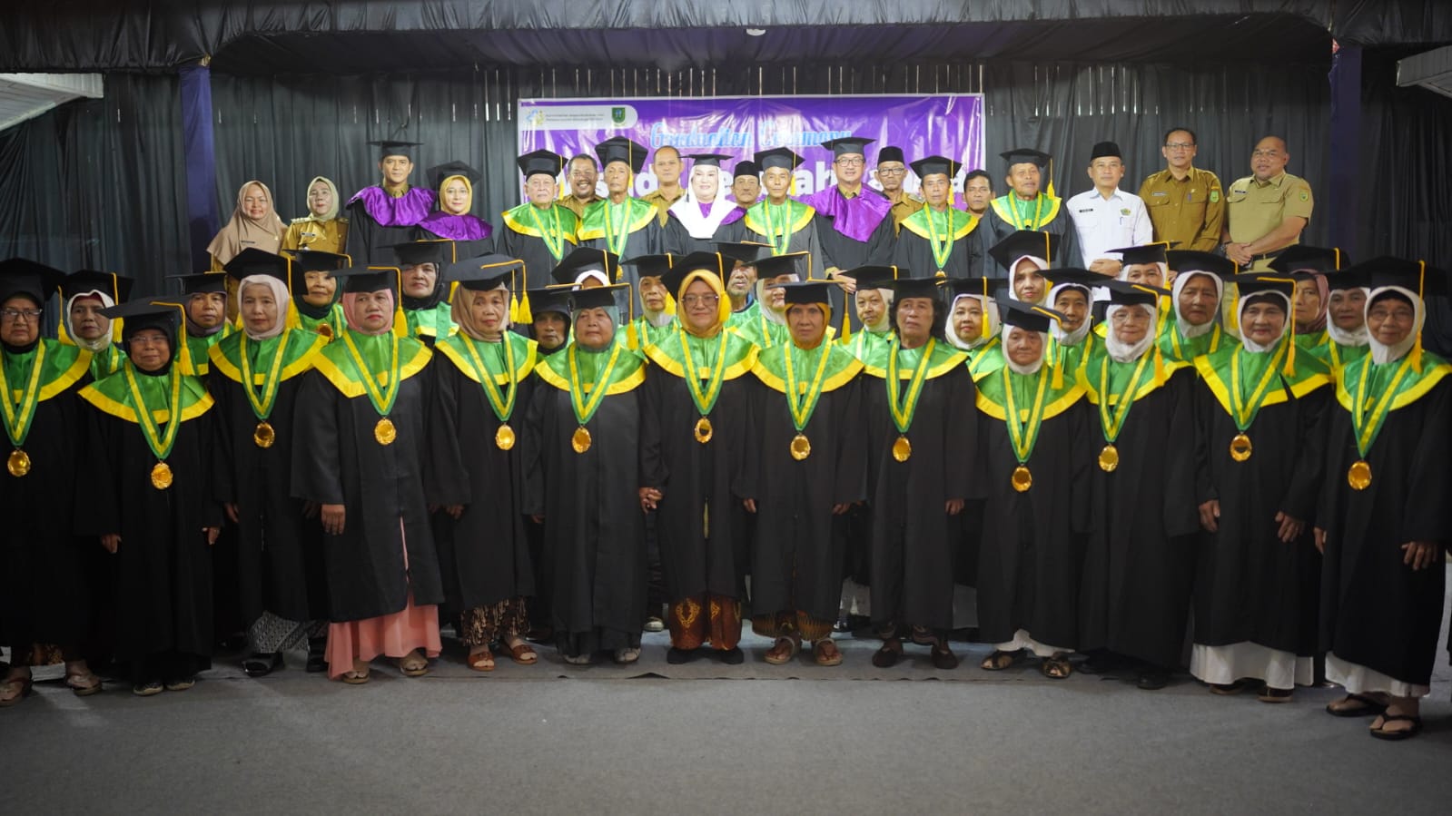 Suasana hangat dan penuh kebanggaan terasa sejak awal kegiatan. Para wisudawan lansia tampak antusias mengenakan atribut wisuda, menjadi simbol bahwa semangat belajar dapat terus tumbuh tanpa dibatasi usia.